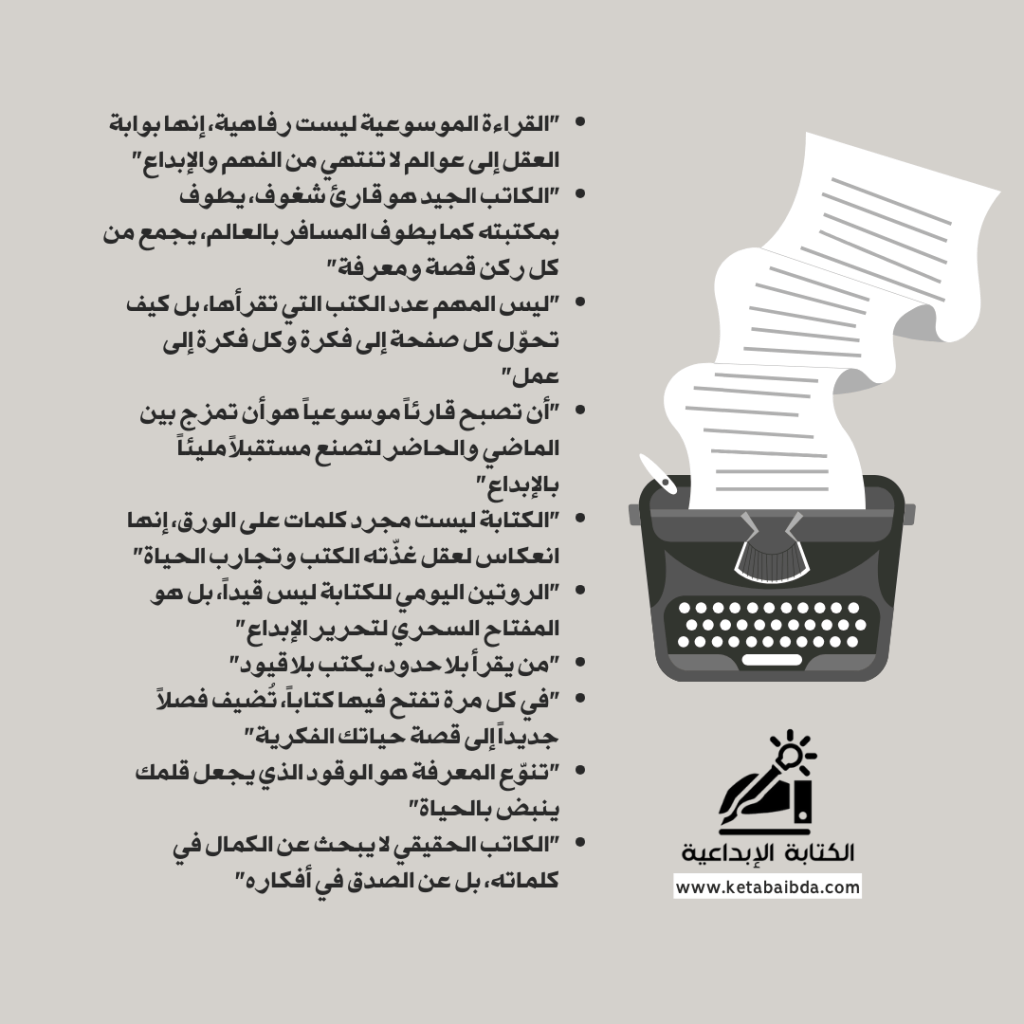 في النهاية، انطلق في رحلتك نحو المعرفة، وكن ذلك الشخص الذي يُبهر الآخرين بعُمق أفكاره وغزارة إنتاجه، ومع كل كتاب تقرؤه وكل مقال تكتبه، ستقترب خطوة من تحقيق هدفك في أن تكون أفضل نسخة من نفسك.