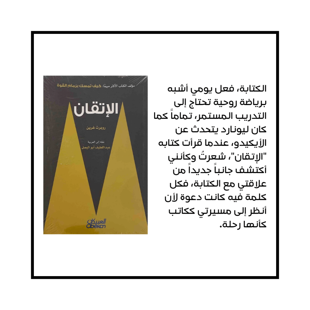 الكتابة، فعل يومي أشبه برياضة روحية تحتاج إلى التدريب المستمر، تماماً كما كان ليونارد يتحدث عن الأيكيدو، عندما قرأت كتابه “الإتقان“، شعرتُ وكأنني أكتشف جانباً جديداً من علاقتي مع الكتابة، فكل كلمة فيه كانت دعوة لأن أنظر إلى مسيرتي ككاتب كأنها رحلة.