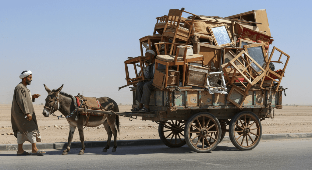 فجأة، مرت عربة كارو تجرها حمارة عجوز، وصاحبها ينادي بصوت خشن: “رُوبابيكيا! رُوبابيكيا!” كان رجلاً في الأربعين، بشرته محروقة من الشمس، ويرتدي جلباب مليء بالثقوب، والعربة مكدسة بالأثاث القديم، كراسي مكسورة، أبواب صدئة، ومرايا مهشمة، كأنها جثث، نظر الحاج عبد الرحيم إلى العربة وابتسم ابتسامة خفيفة، ربما تمنى لو يبيع همومه مع تلك الأشياء البالية، لكن من يشتري ما لا يُرى؟ التفت إلى أبو السيد وقال: “الراجل ده بيشيل أحزان الناس وهو ما يعرفش” ضحك أبو السيد ضحكة خافتة وقال: “ومين فينا مش شايل يا حاج؟ كلنا روبابيكيا بطريقتنا”